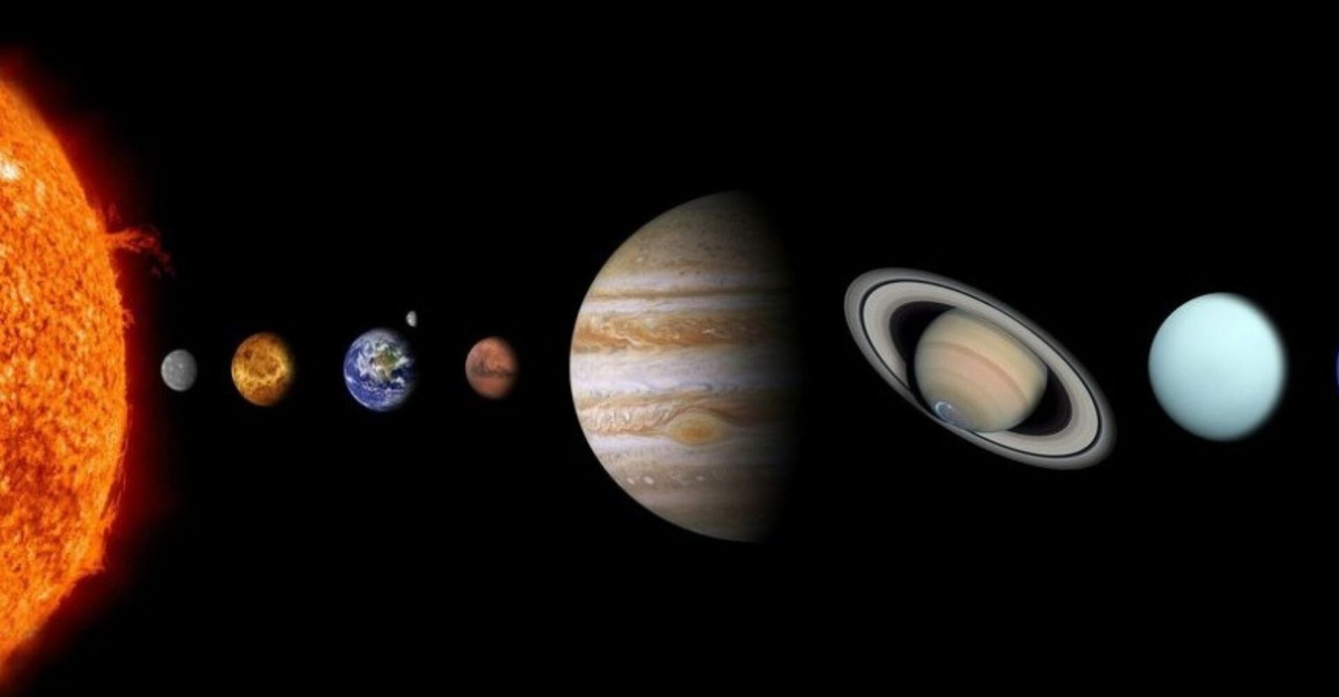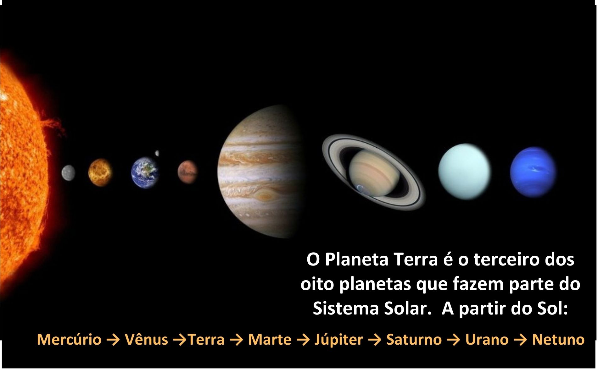 O planeta Terra é um dos quatro planetas telúricos (de formação rochosa) do Sistema Solar, sendo os outro: Mercúrio, Vênus e Marte. Imagem do Sistema Solar (da esquerda para a direita: Sol, Mercúrio, Vênus, Terra, Marte Júpiter, Saturno, Urano e Netuno).