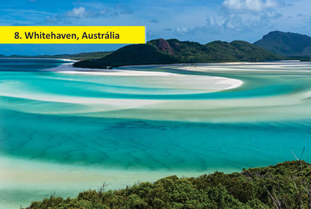 A Austrália é também um país repleto de belezas naturais e cenários paradisíacos. Por lá, a Praia Whitehaven se destaca por suas características morfológicas que, devido à movimentação da sua areia fina, muda de paisagem a cada momento. Além disso, a enseada de Hill Inlet é um dos locais mais fotografados e bonitos do mundo.